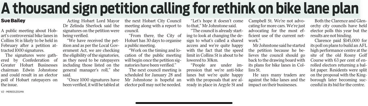 A public meeting about Hobart’s controversial bike lanes in Collins St is likely to be held in February after a petition attracted 1000 signatures.