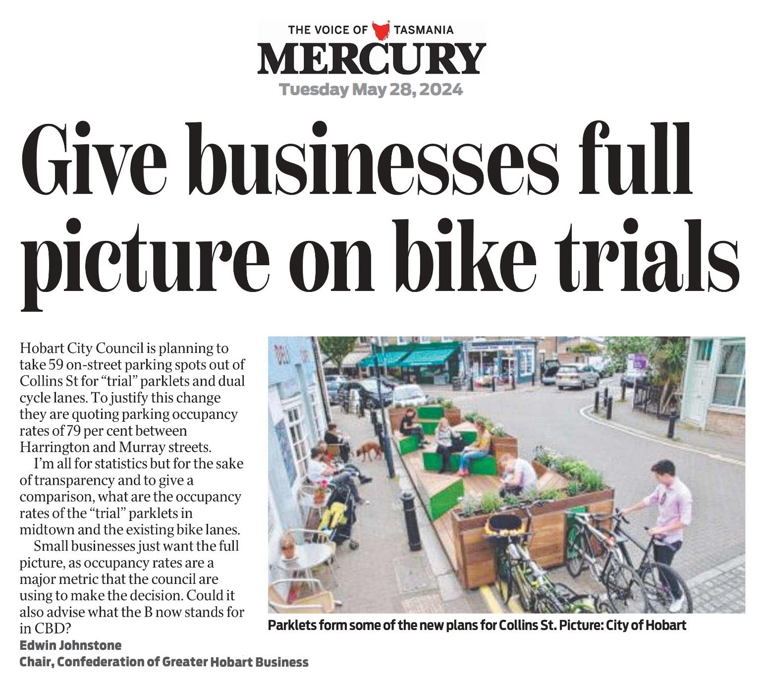 The Hobart City Council are planning to take 59 on street parking spots out of Collins Street for “trial” parklets and dual cycle lanes. To justify this change they are quoting parking occupancy rates of 79% between Harrington and Murray St.