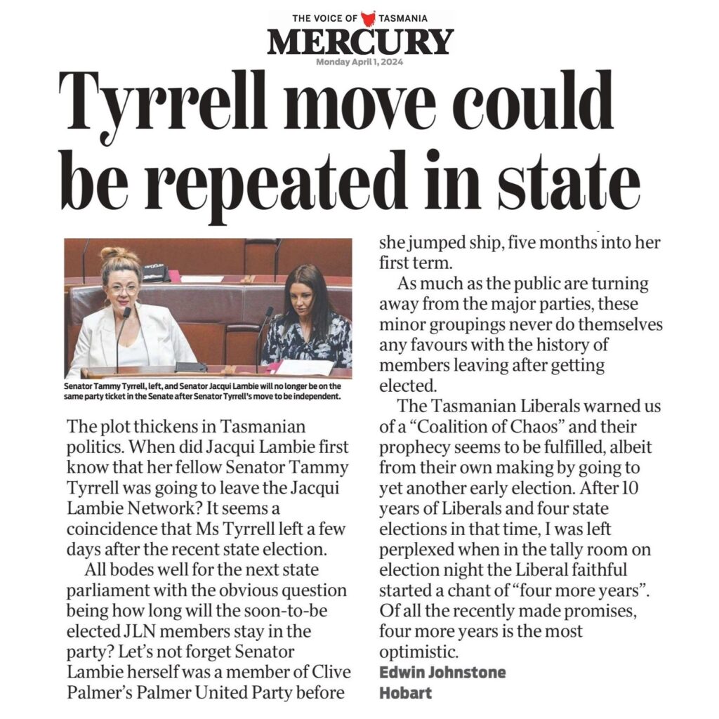 The plot thickens in Tasmanian politics. When did Jackie Lambie first know that Tammy Tyrrell was going to leave the Jackie Lambie Network? Seems a coincidence that Tammy left a few days after the recent state election.