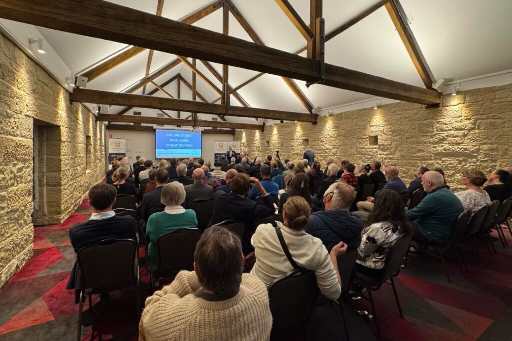 The meeting was a great success with over 100 people in attendance. While the night was about the bike lane proposal for Collins Street that issue was the tip of the iceberg with business confidence in the Hobart City Council at an all-time low.